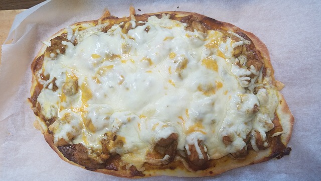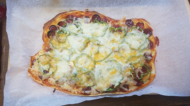 ピザ生地にピザソースを塗って、玉ねぎピーマンカルパスシュレッドチーズを乗せて焼いたもの。