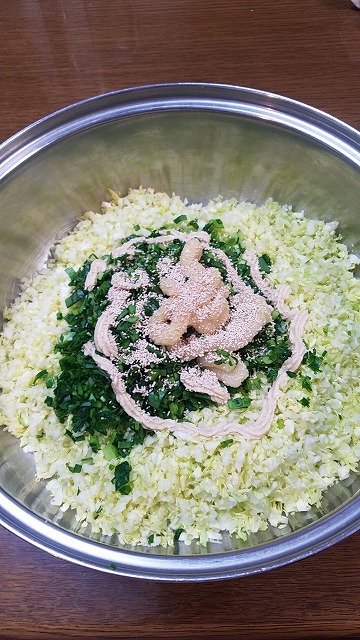 キャベツとニラを適量みじん切り、中華スープの素、ニンニク、ショウガ、あと塩コショウ。